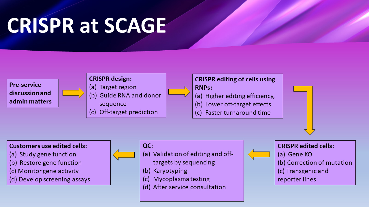 SCAGE uses a newer method involving RNP electroporation for gene editing. This method has been shown to have higher editing efficiency, lower off-target effects and faster turnaround time than the conventional plasmid-based method. We offer CRISPR service to perform the following: